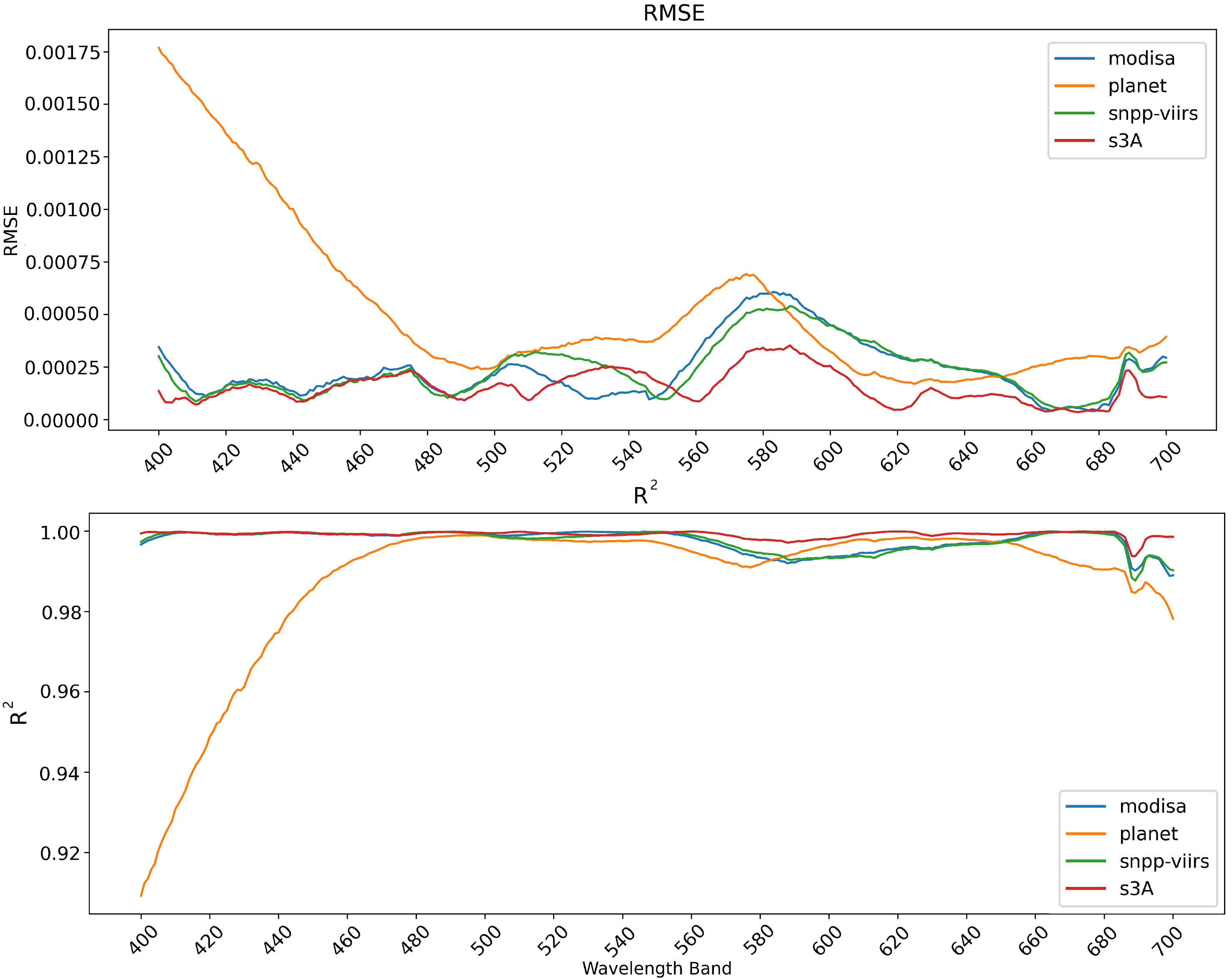 The and RMSE per wavelength band for each of the models (MODIS, VIIRS, OLCI, Planet) trained on the full dataset.