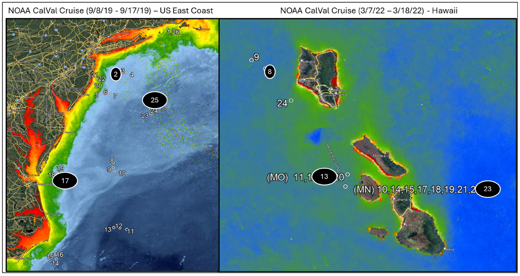 The stations for each of the NOAA Cal/Val cruises used in this evaluation. Stations 1–26 for the 2019 East Coast cruise are shown on the left and stations 8–23 for the 2022 Hawaii cruise are on the right.