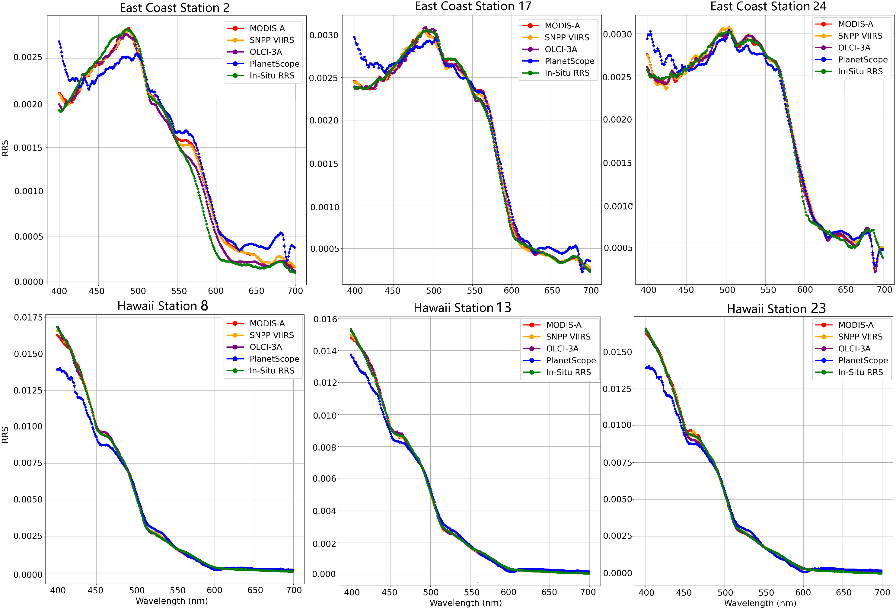 The performance of the estimated hyperspectral curve for each model on data from three randomly selected East Coast stations (top) and three randomly selected Hawaii stations (bottom), and the in situ data is compared.