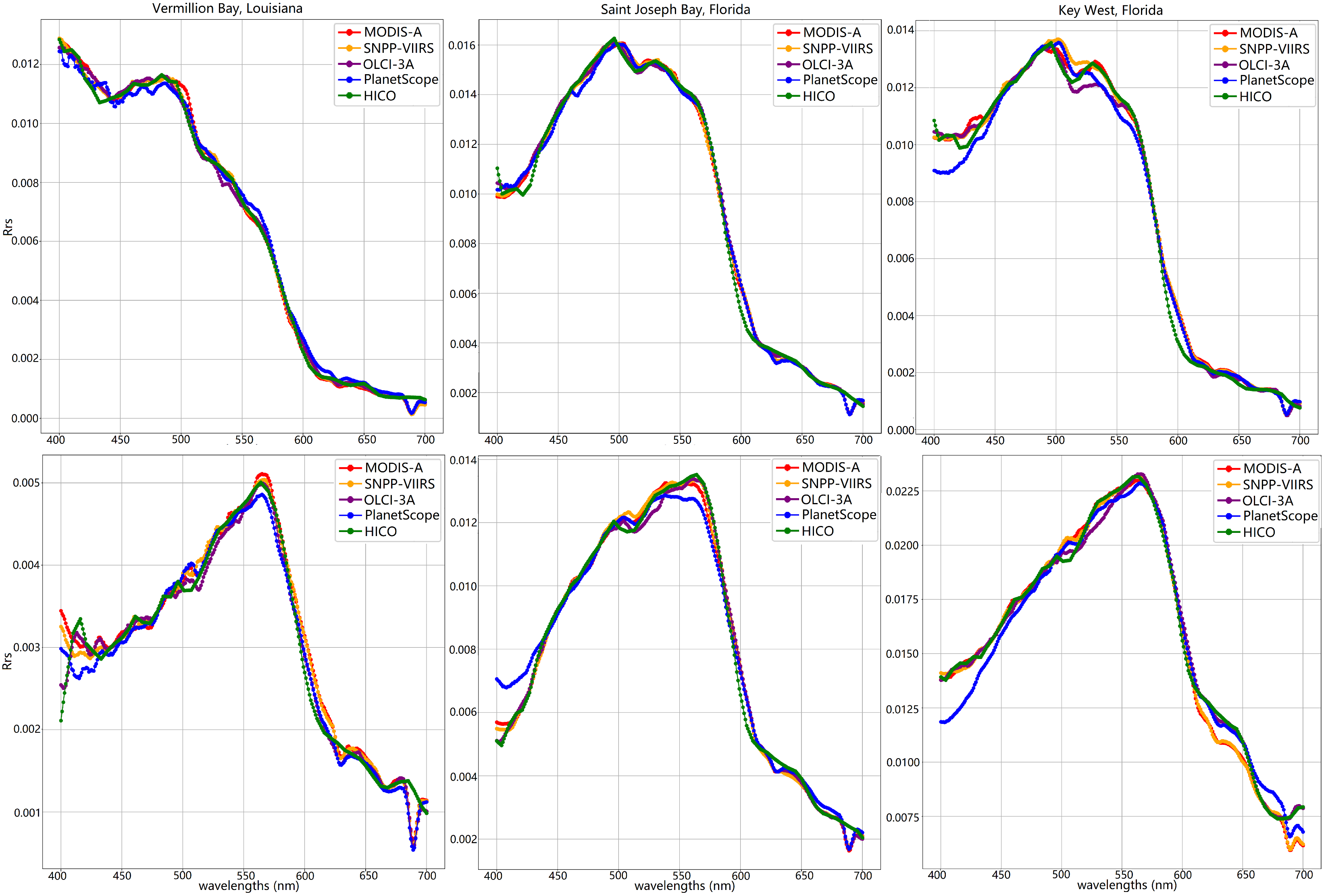 Two points—one near the bottom, one near the top of the valid data—were taken for each of the HICO scenes to compare the hyperspectral predictions for Vermillion Bay (Left); Saint Joseph Bay (Middle); Key West_ISS.nc (Right).