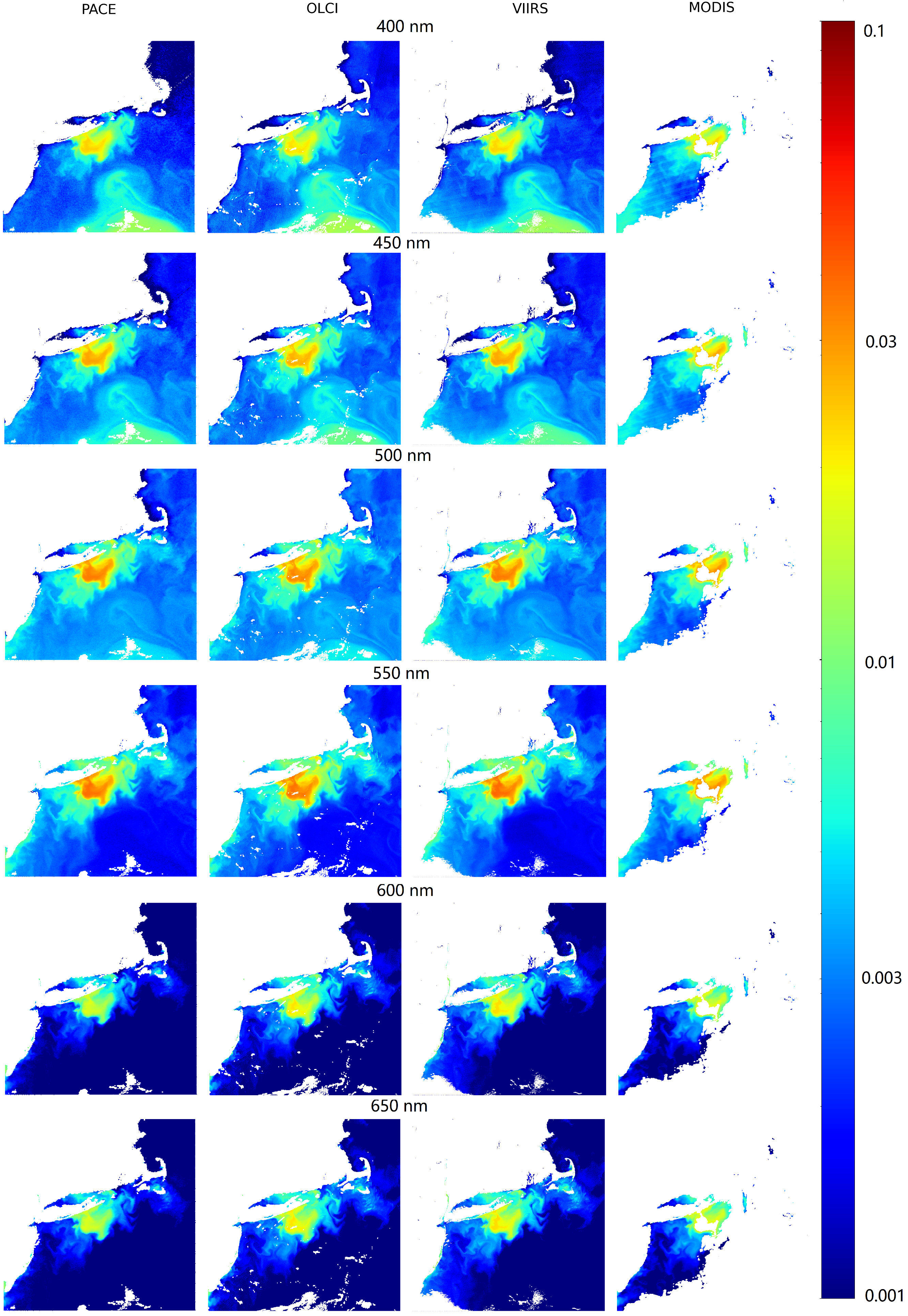 1]. Interest in hyperspectral data is growing with advances in in situ instruments (e.g., WETLabs ac-s) and satellite sensors such as NASA’s Plankton, Aerosol, Cloud, Ocean Ecosystem Ocean Color Instrument (PACE OCI), though pathways for utilizing these high-dimensional datasets are in their early stages. The WETLabs ac-s is a ship-based spectrophotometer that provides high-resolution in-water absorption and attenuation spectra, making it a valuable source of reference data, though its coverage is limited to discrete sampling locations [