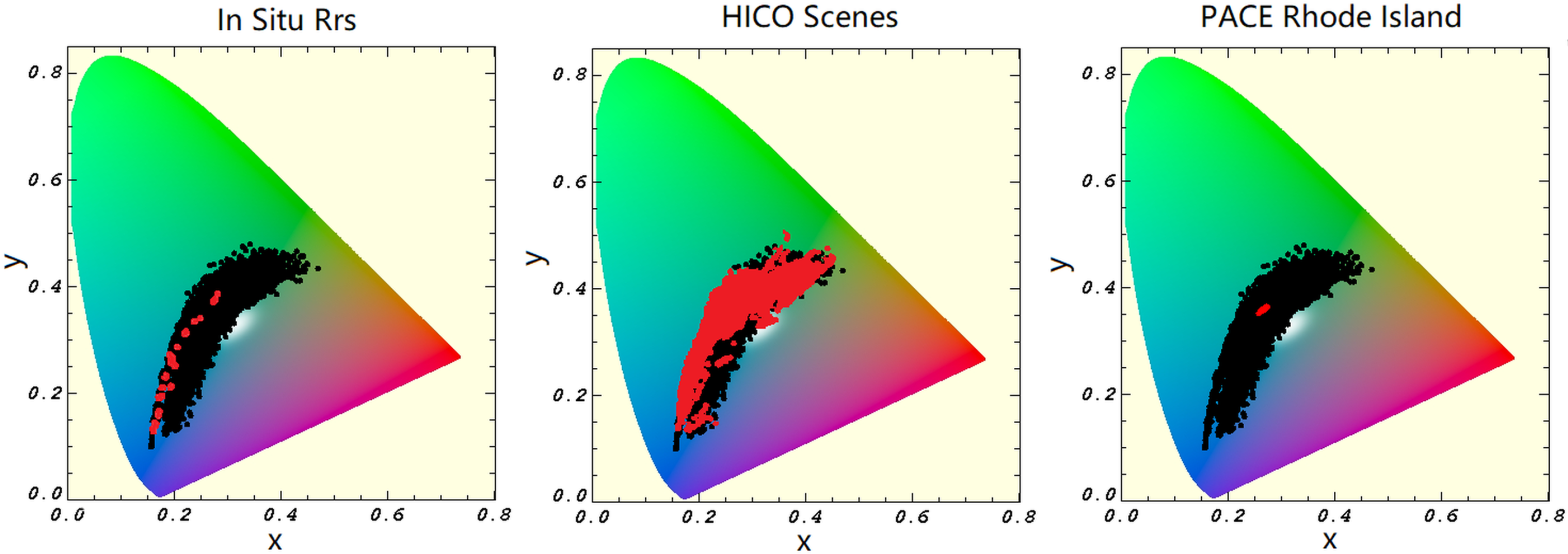 Here we compare the covered chromaticity space for the validation sets versus the training set. The in situ dataset is depicted to the right, HICO in the middle, then in the far right image is the PACE OCI Rhode Island scene. The chromaticity space of each validation dataset is displayed in red and overlaid on the full training data space (black).