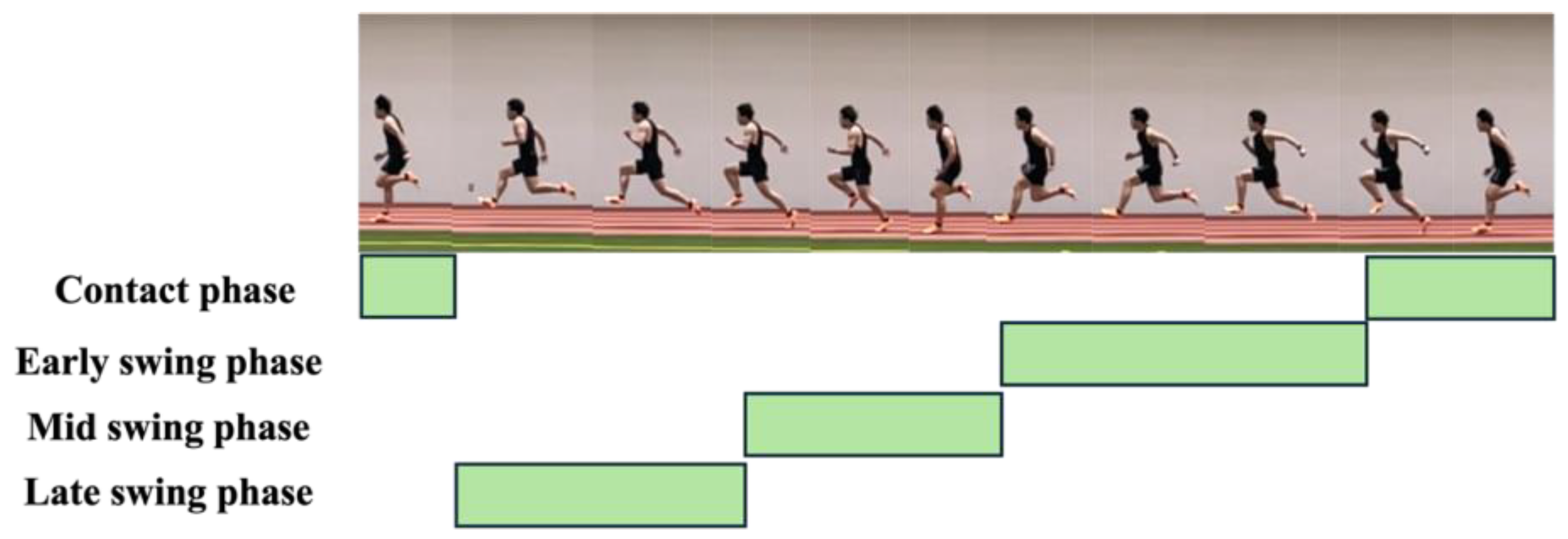 - Kakehata, G.; Goto, Y.; Iso, S.; Kanosue, K. Timing of Rectus Femoris and Biceps Femoris Muscle Activities in Both Legs at Maximal Running Speed. Med. Sci. Sports Exerc. 2021, 53, 643–652. [Google Scholar] [CrossRef]