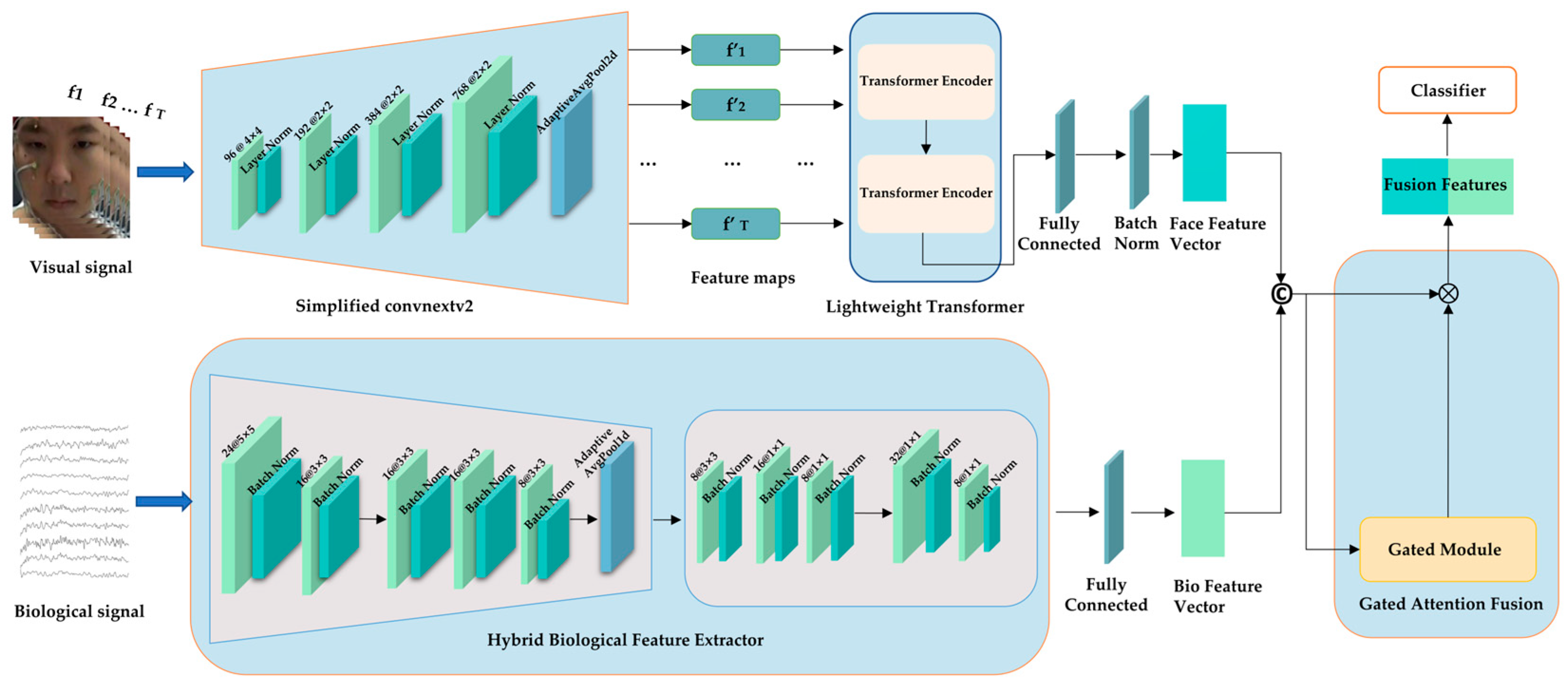 Figure 1 shows the Gated Biological Visual Network multimodal emotion recognition model proposed in this paper. The model processes aligned temporal sequences of facial expression frames (visual stream) and physiological signals, including EEG, ECG, EOG, and GSR (biological stream). Its core comprises dual specialized extractors: a visual feature extractor based on an enhanced ConvNeXt V2 network that captures spatial features, followed by a lightweight Transformer encoder for modeling temporal dynamics in facial expressions, and a hybrid physiological feature extractor that employs a hierarchical structure combining 1D-CNNs for local patterns, a Temporal Convolutional Network (TCN) for medium-range dependencies, and a convolutional self-attention mechanism for global context. An innovative gated attention fusion module integrates the extracted features from both modalities. The resulting representation is ultimately classified to output emotion probabilities. This end-to-end architecture optimizes multimodal feature representation while ensuring computational efficiency.