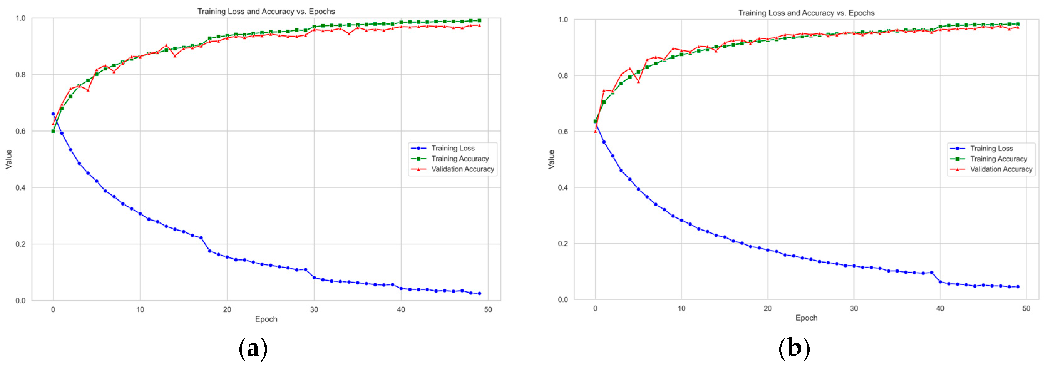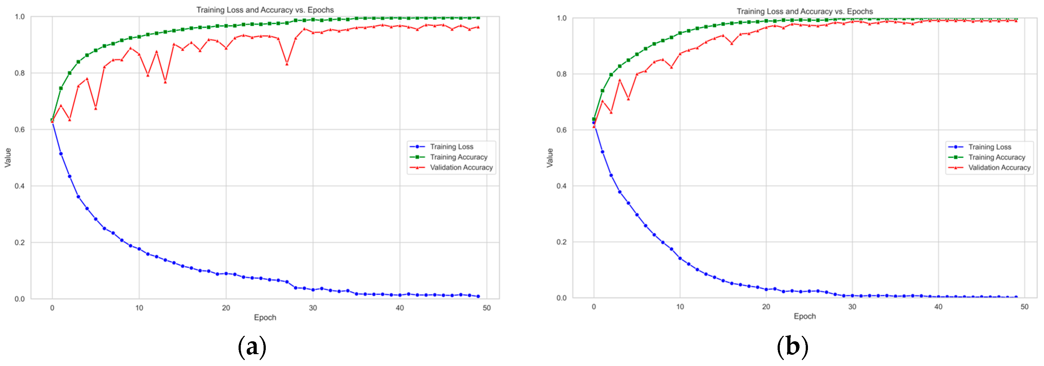 • Monitoring Learning Curves: The training and validation accuracy and loss curves were meticulously monitored throughout the training process (as shown in Figure 2 and Figure 3). The close alignment and concurrent convergence of these curves, without a significant divergence, indicate that the model was learning generalizable patterns rather than memorizing the training data.