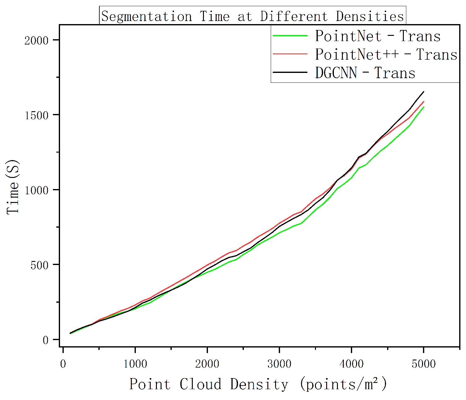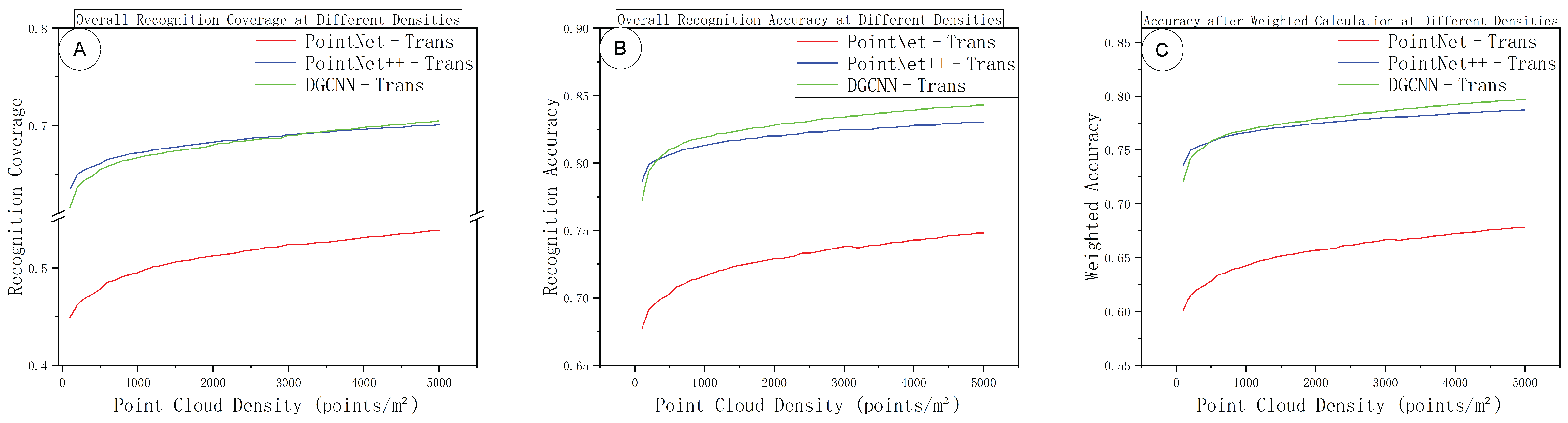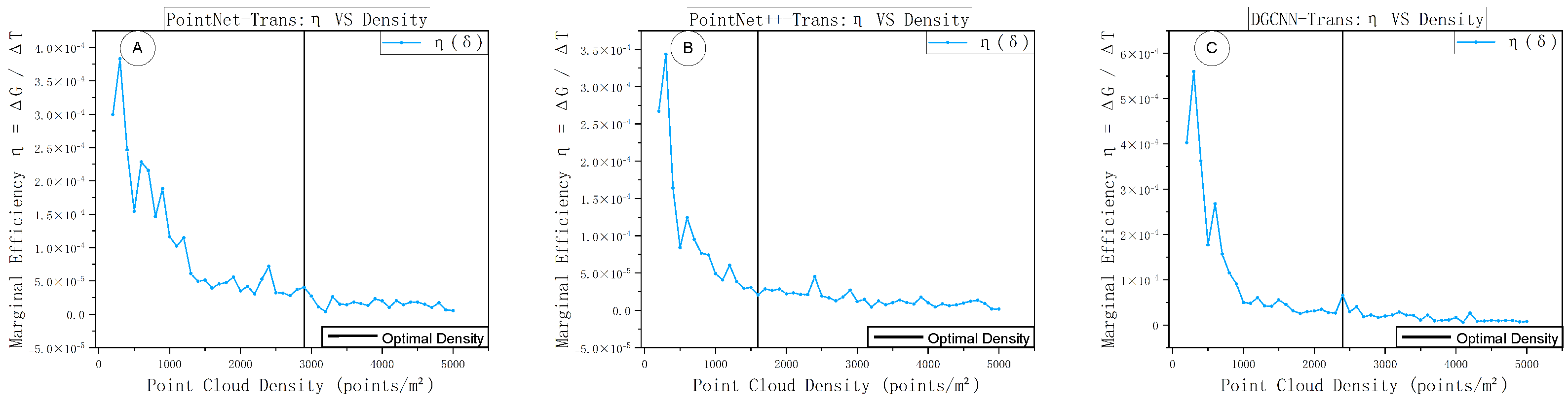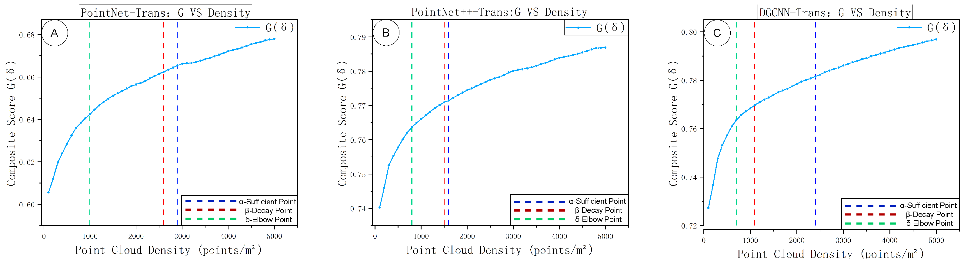 47]. We insert an identical Transformer module after the high-level features in all three backbones and perform feature fusion, allowing these different modeling mechanisms to accommodate the “density” variable in a consistent way. Accordingly, our analysis centers on quantifying the optimal sampling density rather than comparing the relative superiority of the models. To keep the density–performance relation interpretable and reproducible, we deliberately select three classical yet representative backbones that span point-wise MLPs (PointNet), hierarchical grouping (PointNet++), and graph-based local topology (DGCNN). Recent state-of-the-art systems such as sparse 3D CNNs (e.g., MinkowskiNet), efficient random sampling networks (e.g., RandLA-Net), and Transformer-only encoders (e.g., Point Transformer) employ architecture-specific sparsity or sampling policies that materially change runtime/memory scaling. Introducing them here would confound “density” with model capacity and framework-level optimizations. Our objective in this study is therefore to provide a model-agnostic selector where density is the only independent variable; systematic extensions to newer backbones under the same unified protocol are planned in follow-up work.