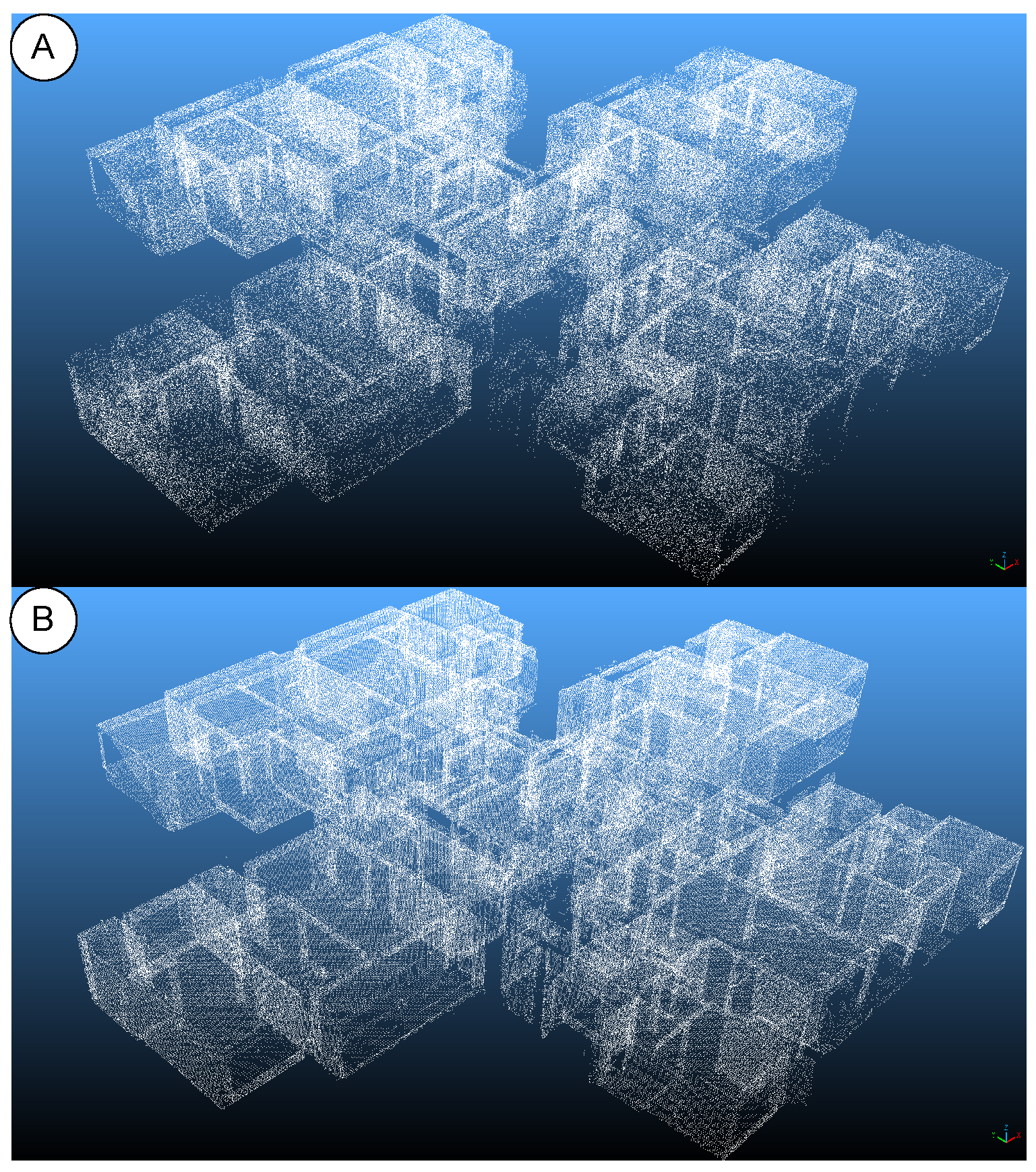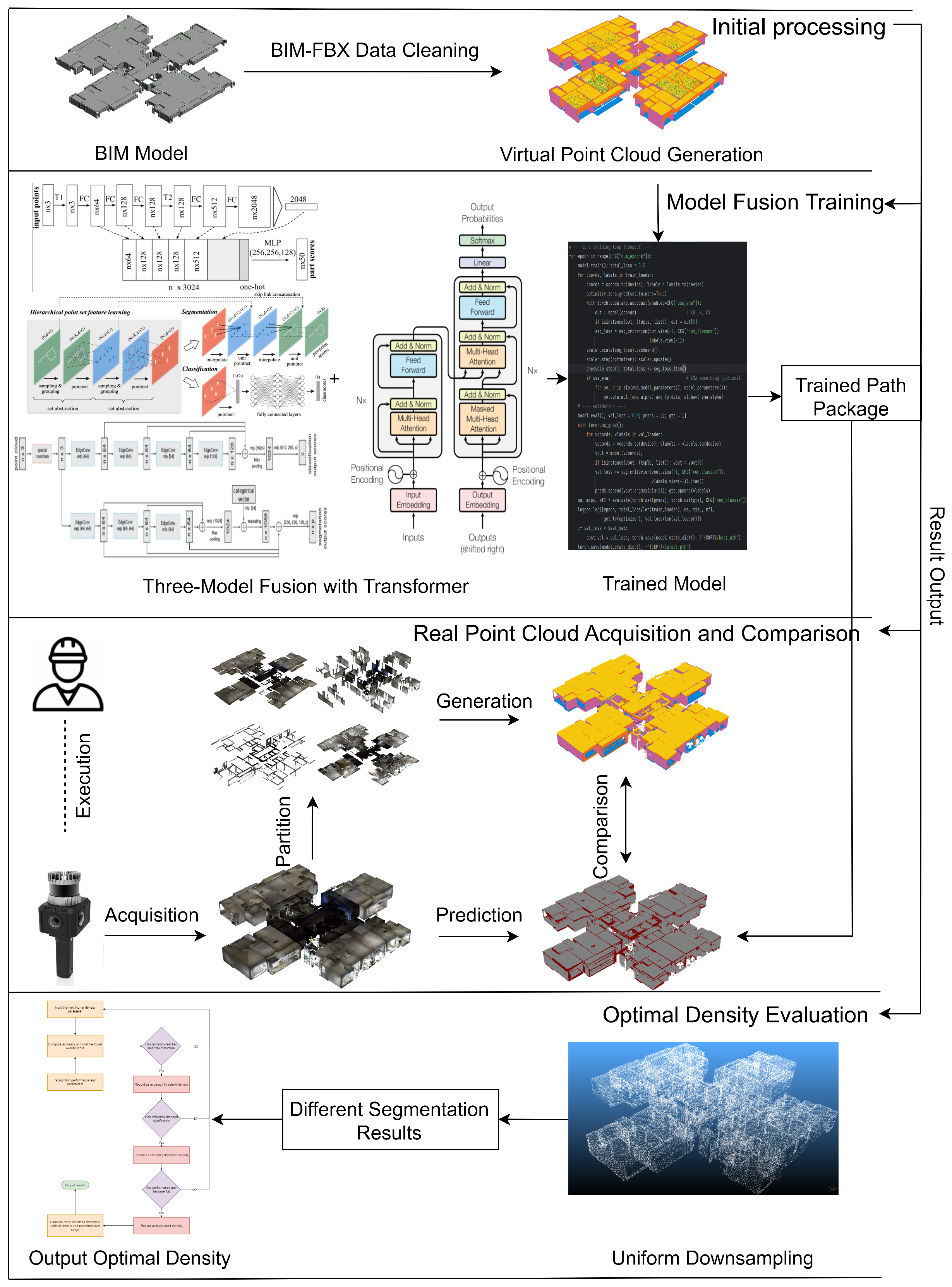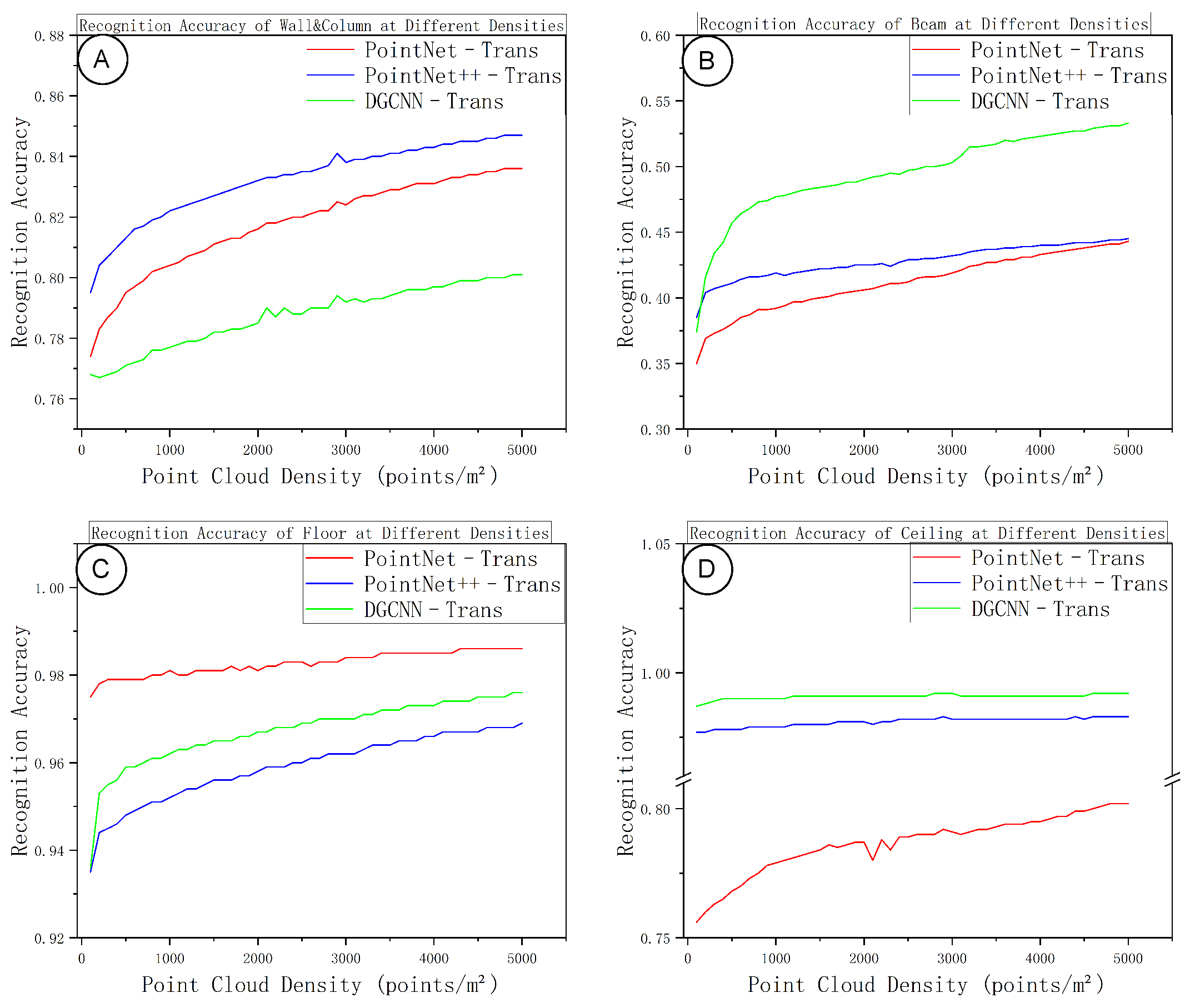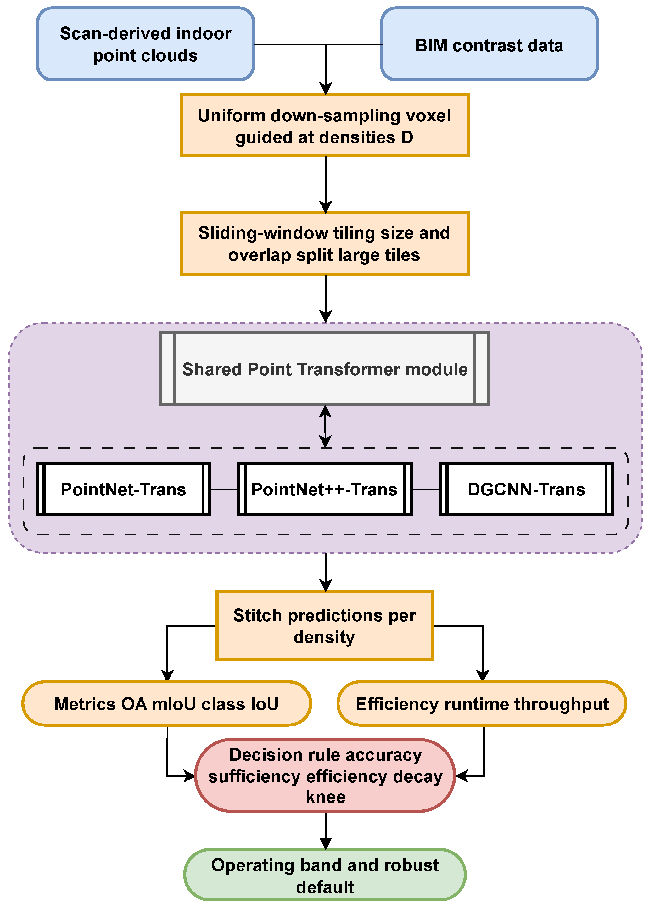 47]. We insert an identical Transformer module after the high-level features in all three backbones and perform feature fusion, allowing these different modeling mechanisms to accommodate the “density” variable in a consistent way. Accordingly, our analysis centers on quantifying the optimal sampling density rather than comparing the relative superiority of the models. To keep the density–performance relation interpretable and reproducible, we deliberately select three classical yet representative backbones that span point-wise MLPs (PointNet), hierarchical grouping (PointNet++), and graph-based local topology (DGCNN). Recent state-of-the-art systems such as sparse 3D CNNs (e.g., MinkowskiNet), efficient random sampling networks (e.g., RandLA-Net), and Transformer-only encoders (e.g., Point Transformer) employ architecture-specific sparsity or sampling policies that materially change runtime/memory scaling. Introducing them here would confound “density” with model capacity and framework-level optimizations. Our objective in this study is therefore to provide a model-agnostic selector where density is the only independent variable; systematic extensions to newer backbones under the same unified protocol are planned in follow-up work.