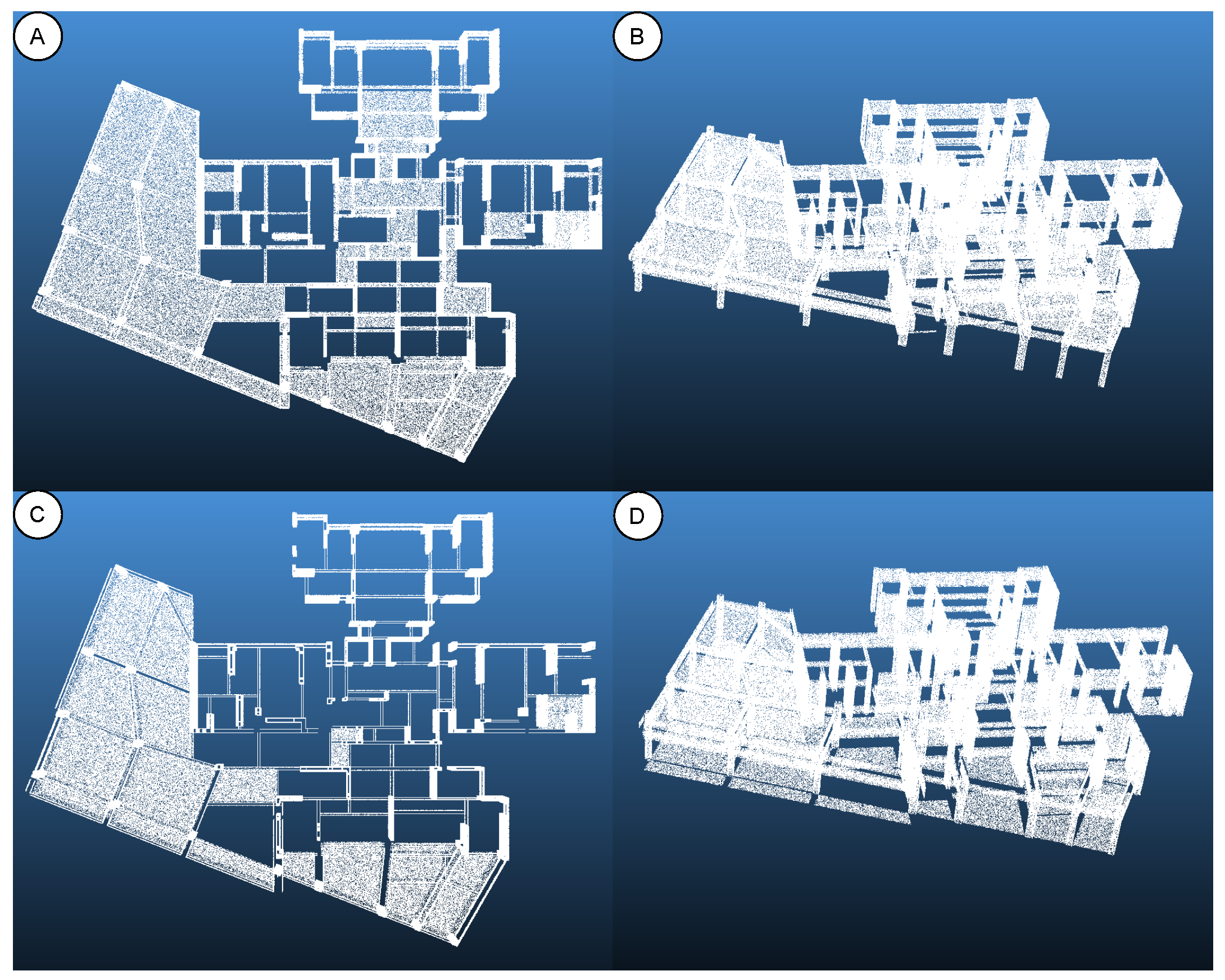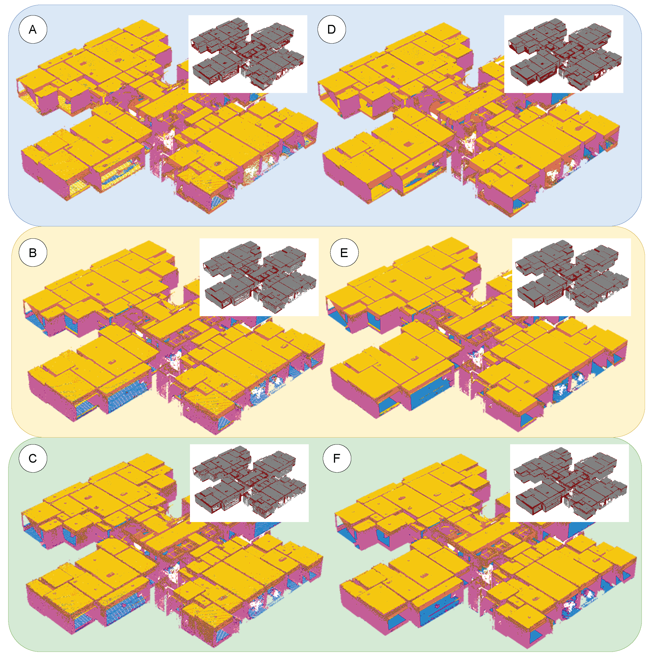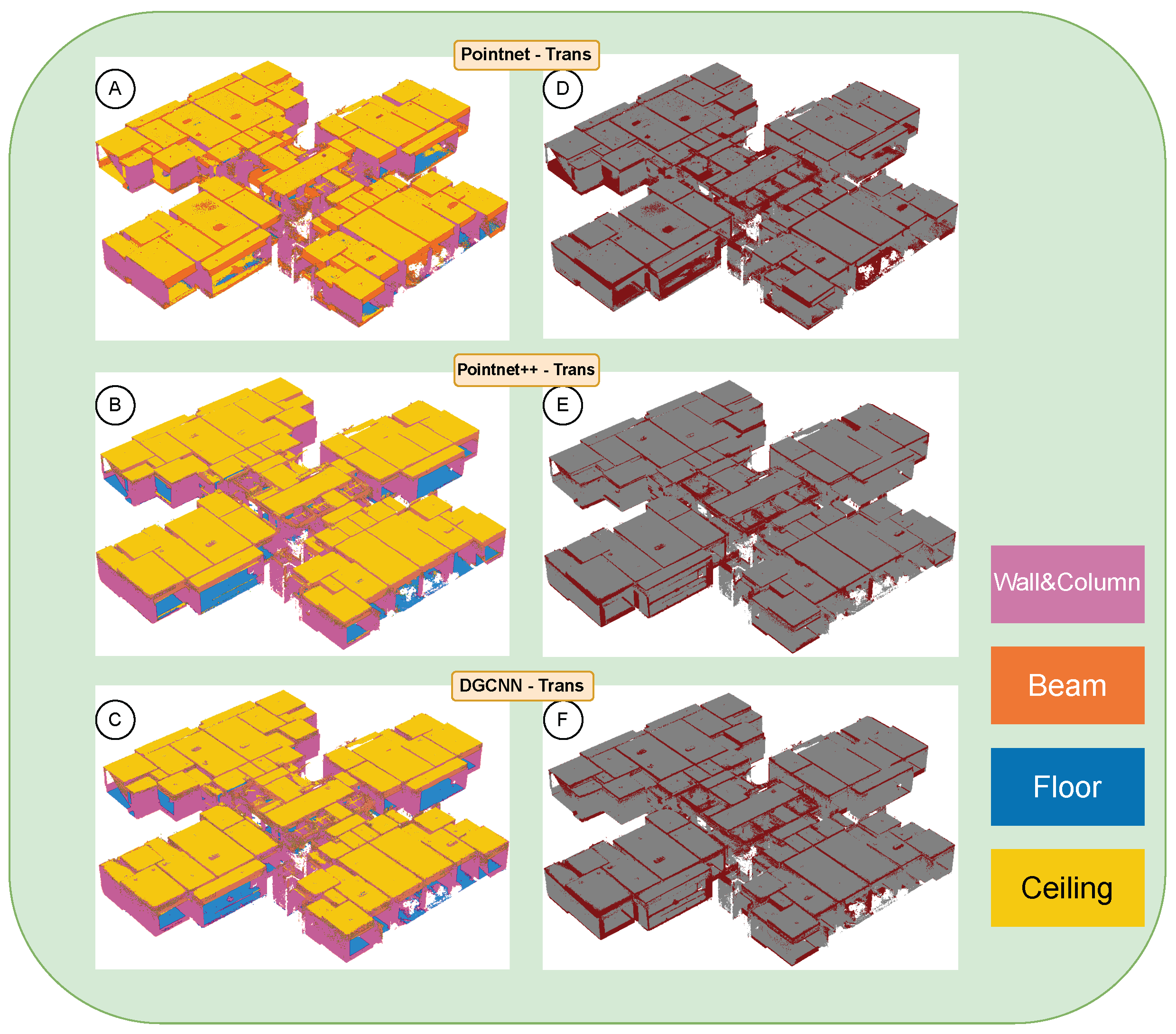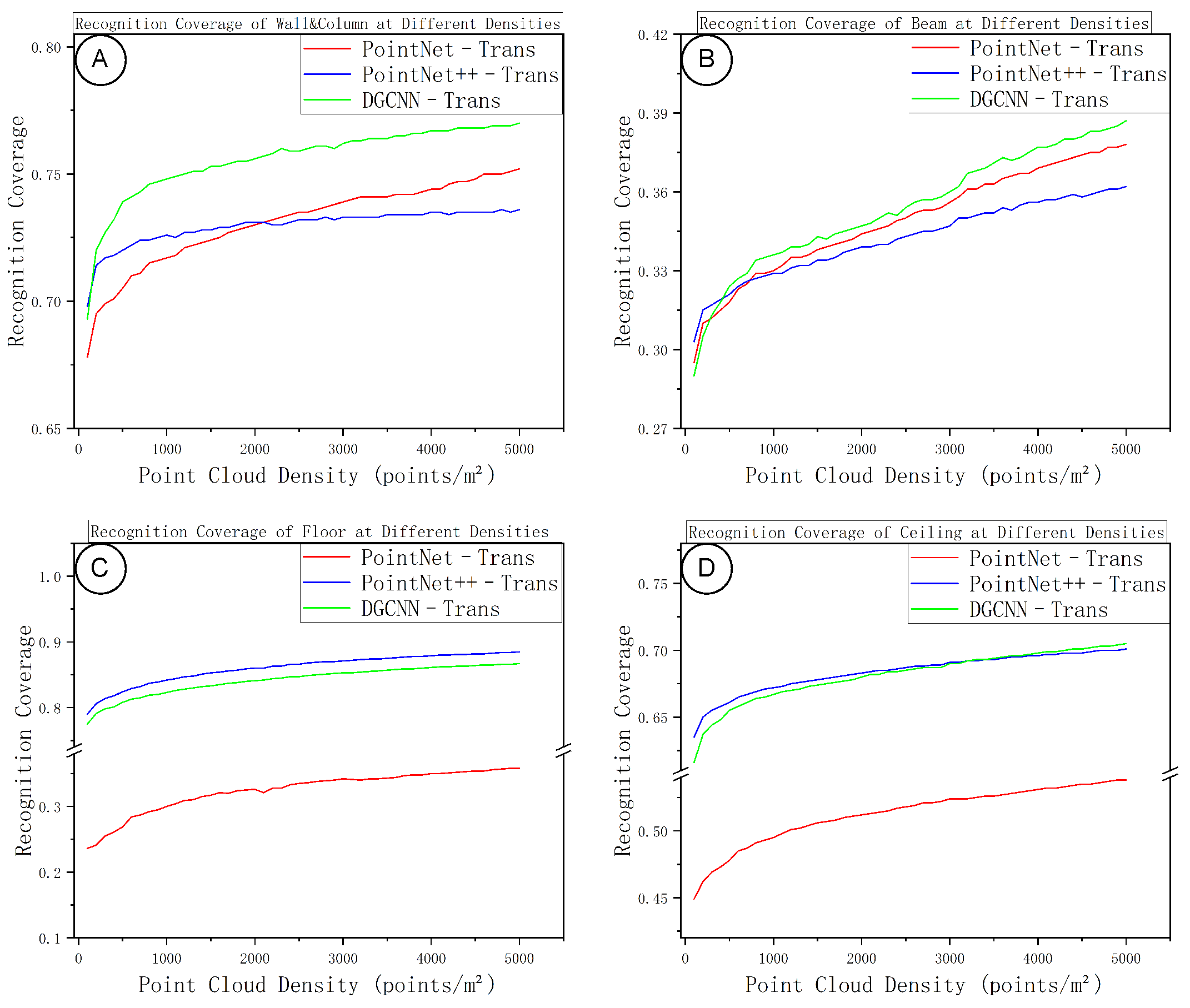 After training, the model is applied to inference on real point clouds. In the testing phase, we reuse the same tiling and overlap strategy as in training, segmenting the input point cloud block by block and performing voting fusion in overlapping regions to reconstruct complete component-level semantic labels. The results are then compared with those from synthetic data to assess recognition performance across data sources. The classification system includes four component categories—walls and columns (0), beams (1), floors (2), and ceilings (3)—and we compute category-wise accuracy and coverage to analyze class-level differences.