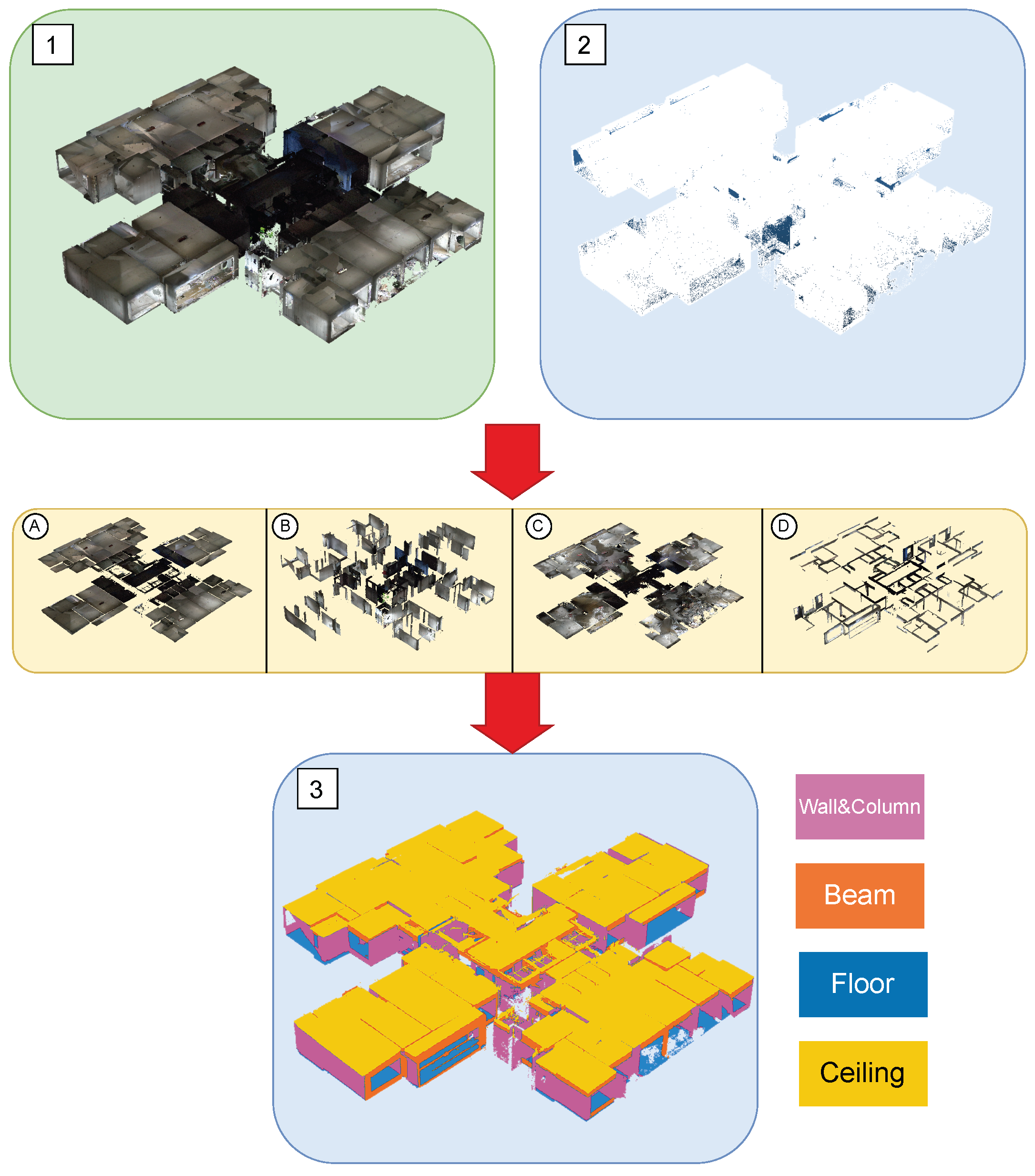 45]; channel-wise feature fusion and class-aware attention are applied for further refinement; and finally, a unified point-wise classification head outputs semantic probabilities for the four component categories (walls and columns, beams, floors, and ceilings) [