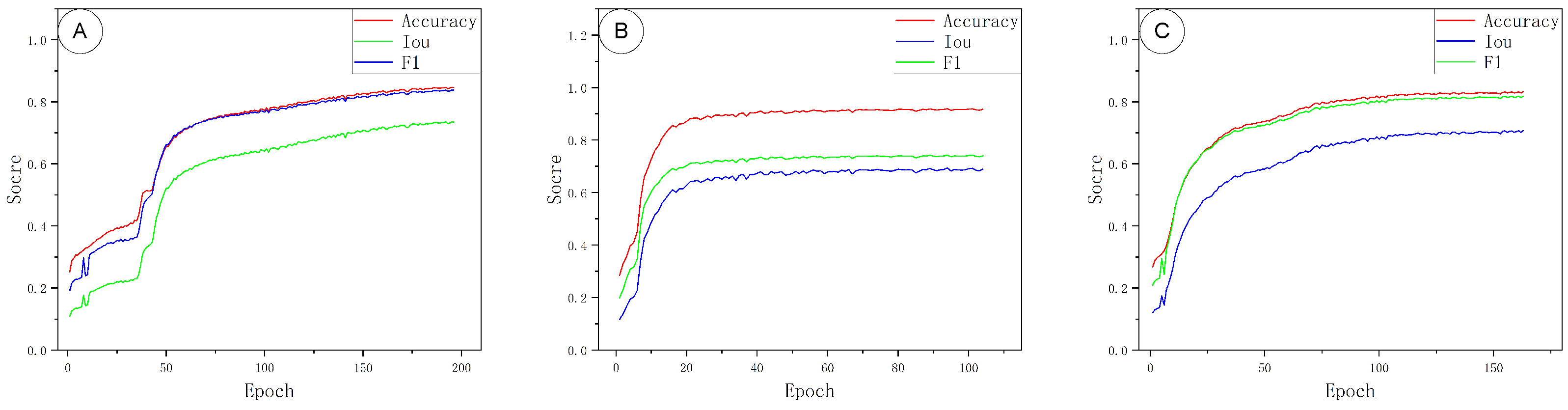 The evaluation metrics remain consistent with those used during training and validation: at each epoch we compute Overall Accuracy (OA), mean Intersection over Union (mIoU), macro-F1, and per-class IoU, and generate a confusion matrix for error diagnosis. IoU measures the overlap between predictions and ground truth; mIoU is the arithmetic mean of per-class IoUs; F1 combines precision and recall to characterize overall classification effectiveness.