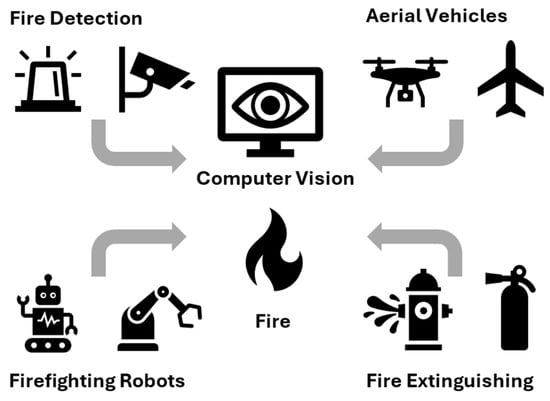From a practical point of view, fire management involves several aspects, such as flame detection and extinguishing (see Figure 1). Fire management techniques [10,18,19], combined with recent advances in scientific and technological thought—including artificial intelligence algorithms for multifaceted image processing aimed at fire detection and monitoring—can contribute to a better understanding of the causes of fires, the phenomena accompanying them, detecting flames at significantly greater distances than traditional smoke or temperature sensors, and—once a fire is positively detected—determining the direction of flame spread and enabling rapid extinguishing [20,21]. This is particularly important given that environmental parameters and weather fluctuations affect the performance of such systems [22,23,24].