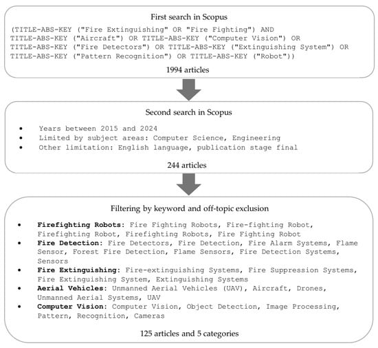 (TITLE-ABS-KEY (“Fire Extinguishing” OR “Fire Fighting”) AND TITLE-ABS-KEY (“Aircraft”) OR TITLE-ABS-KEY (“Computer Vision”) OR TITLE-ABS-KEY (“Fire Detectors”) OR TITLE-ABS-KEY (“Extinguishing System”) OR TITLE-ABS-KEY (“Pattern Recognition”) OR TITLE-ABS-KEY (“Robot”)).