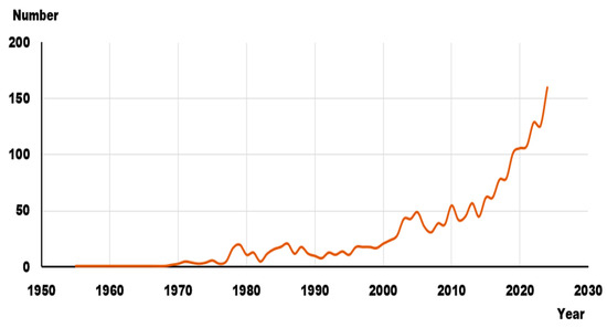 According to the presented methodology, a primary analysis of scientific publications presented in the Scopus database in the area of study was conducted. Figure 3 shows the dynamics of the dependence of the number of publications on the year of publication. As can be seen, before 2000, there was no significant number of scientific publications in the area under study, whereas since 2005, there has been an increase in scientific interest. And in the last 10 years, a sharp surge in publications can be noted (from 50 publications per year to 150).