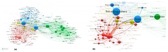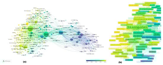 When studying the distribution of keywords co-occurrence by year (Figure 7a), the research on issues directly related to fire extinguishing systems, incidents, health aspects, standardization of fire extinguishing, fires, and design features (before 2000) gradually shifted towards “Fire protection” (2000–2005). Then, the development of fire extinguishing technologies led to a more in-depth study of issues directly related to fire, fire combustion, gaseous fire extinguishing agents, fire safety, risks, fires in aircraft, and simulations (2005–2015). The next 5 years (2015–2020) were significantly associated with “Fire extinguishers”, detection, robots, fire extinguishing agents, and the development of fire extinguishing systems.