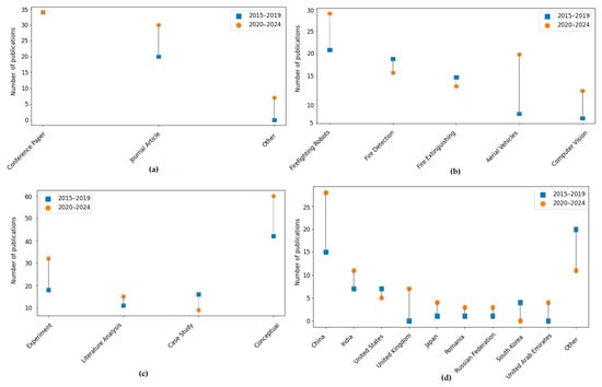 For the category of Document Type, the result of the chi-square test is χ2 = 4.28, df = 2, p = 0.12, suggesting that no significant differences were observed in the distribution of document types between the analyzed periods (2015–2019 and 2020–2024). Conference publications dominate in both time periods (53.6% of all publications). For the Firefighting Technology category, the chi-square test result is χ2 = 7.01, df = 4, p = 0.14, suggesting that no statistically significant changes were found in this category. However, an increase in interest in aerial vehicles and vision systems can be observed from 2020 to 2024. The largest share is held by firefighting robots (40%). In turn, for the category Research Methodology, the result of the chi-square test is χ2 = 5.64, df = 3, p = 0.13, indicating that no statistically significant changes in the research methodology were observed. The conceptual approach continues to dominate, although the number of experiments increases during the period 2020–2024. No statistically significant differences were found in these three main categories (i.e., p > 0.05), indicating that the distribution of document types, technologies used, and research methodologies remained relatively stable during the analyzed periods. The largest share is held by the conceptual approach (81.6%). Despite the lack of significant differences, certain trends are visible. A comprehensive summary in the form of diagrams for all main categories (Table 3) and countries of publication (see Table 4) is provided in Figure 8.