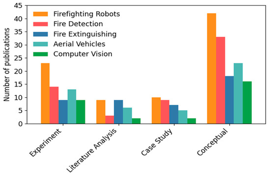 In practice, all publications found in the Scopus database were subjected to analysis to delineate one overarching main area related to Firefighting Technology. Within this domain, five subcategories (subdomains) were specified: Firefighting Robots, Fire Detection, Fire Extinguishing, Aerial Vehicles, and Computer Vision. The publications that belonged to the Firefighting Technology domain contain, in particular, (1) various types and purposes firefighting robots; (2) Fire Detection, including fire detector systems, fire alarm systems, and flame and smoke sensors; (3) Fire Extinguishing—including fire extinguishing and suppression systems; (4) Aerial Vehicles—including unmanned aerial vehicles (UAV), aircrafts, and drones; (5) Computer Vision—including object detection, image processing, pattern, recognition and cameras.