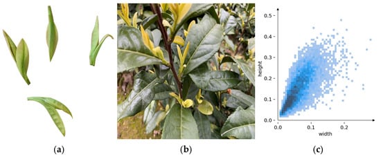 Example of Tea Bud Dataset and Scale Distribution. (a) Tea farmers picking tea leaf samples; (b) Sample Photography; (c) Scale distribution of tea labels in the dataset.