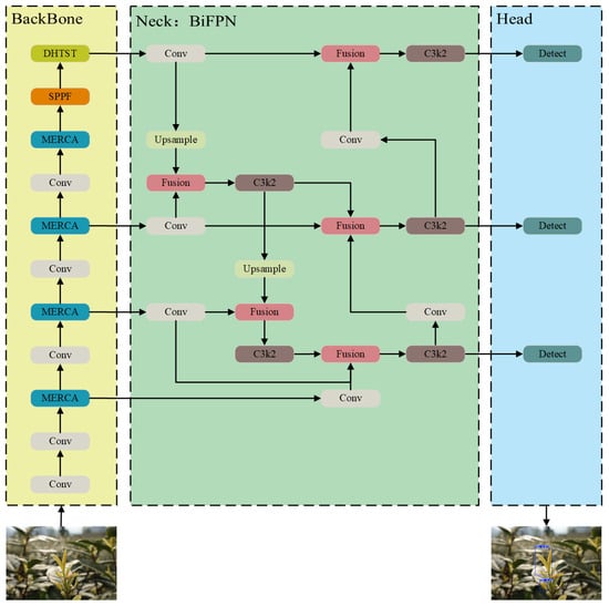 Similarly to mainstream object detection frameworks, the proposed YOLO-LMTB model consists of a backbone network, a feature fusion neck, and a detection head [27], as illustrated in Figure 2.