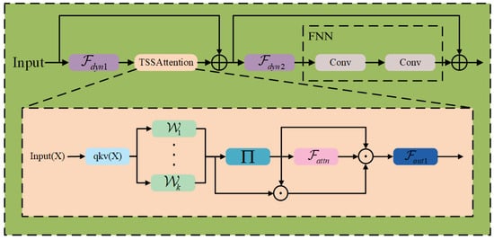 where denotes feature rearrangement into a multi-head format, represents attention weights, denotes learnable parameters, denotes attention outputs, and denotes the output after feature fusion.