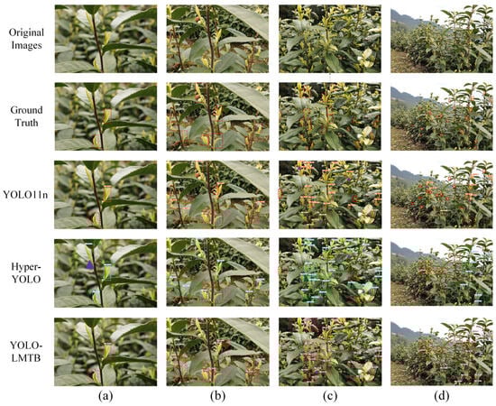 Detection results visualization of YOLO11n, Hyper-YOLO, and YOLO-LMTB. (a) Scenes with few targets, no occlusions, and simple backgrounds; (b) Scenes with moderate targets, occlusions, and simple backgrounds; (c) Scenes with numerous targets, occlusions, and complex backgrounds; (d) Scenes with extremely small targets. Red dashed boxes indicate missed targets; purple triangles indicate false positives.
