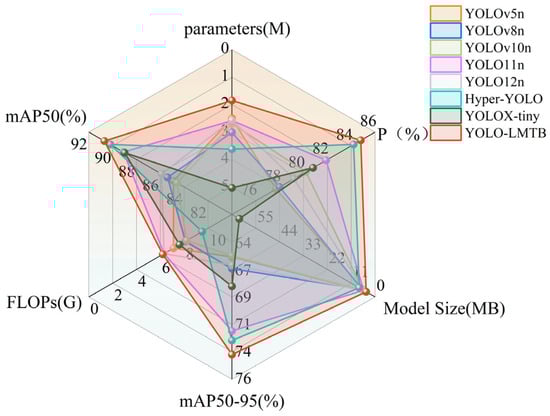 Figure 6 presents a comparison of the detection performance among YOLOv11n, Hyper-YOLO, and the proposed YOLO-LMTB model. As illustrated, YOLOv11n and Hyper-YOLO exhibit varying degrees of missed detections and false positives when handling occluded and densely distributed targets. In particular, both models detect significantly fewer extremely small tea buds compared to YOLO-LMTB. Moreover, their confidence scores are mostly lower across all scenarios than those of YOLO-LMTB. These results indicate that YOLO-LMTB achieves superior detection performance in challenging environments characterized by dense distributions, partial occlusions, and significant scale variations among tea buds. Figure 7 provides an intuitive visualization via a radar chart based on the experimental data from Table 1, further emphasizing the outstanding performance of YOLO-LMTB across multiple metrics.