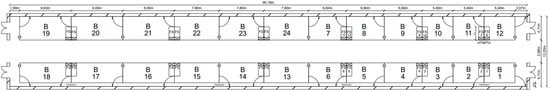 Floor plan of the barn for feedlot cattle; B = box/pen, FS = feeding station.