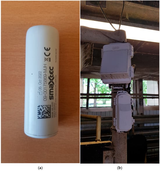 The animals were equipped with rumen sensor boluses (smaXtec animal care GmbH, Graz, Austria), which were 210 g in weight and 105 × 35 mm in size. At the age of nine months, the rumen sensor boluses were inserted with a dispenser (by a veterinarian, as suggested by the developers) and placed at the reticulum when the minimum body weight was 300 kg. The non-invasive measures performed on the animals associated with the experimental project were approved by the State Office for Occupational Safety, Consumer Protection, and Health in Brandenburg under the designation V6-2347/0-2022-10. All the data were captured every 10 min and transferred via Wi-Fi to a messenger service (smaXtec messenger® v4.8.21 software, Graz, Austria). The following characteristics were used in the study: reticulorumen temperature in °C, motion activity index (range 0 to 100), and rumination index (lapse of reticular contractions within 24 h in seconds measured by roll-over of the accelerometer). Every reticulorumen temperature drop of at least 1.5 °C from the previously recorded value within a period of no more than 10 min was detected as one drinking cycle (a drinking event lasts on average 1–3 min, and the values are recorded every 10 min) and set aside from the data table. Specifically, the rumen pH was measured in 14 bulls (two per group) using a different bolus from the same developer (length: 120 mm; width: 35 mm; weight: 210 g). pH probes calibration was performed using pH 7 buffer solutions at the beginning of the experiment. Because of its dimensions, this indwelling system can be orally administered to adult cattle and is shockproof and resistant to rumen fluid (Figure 2a).