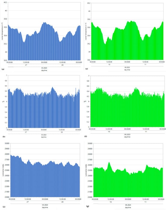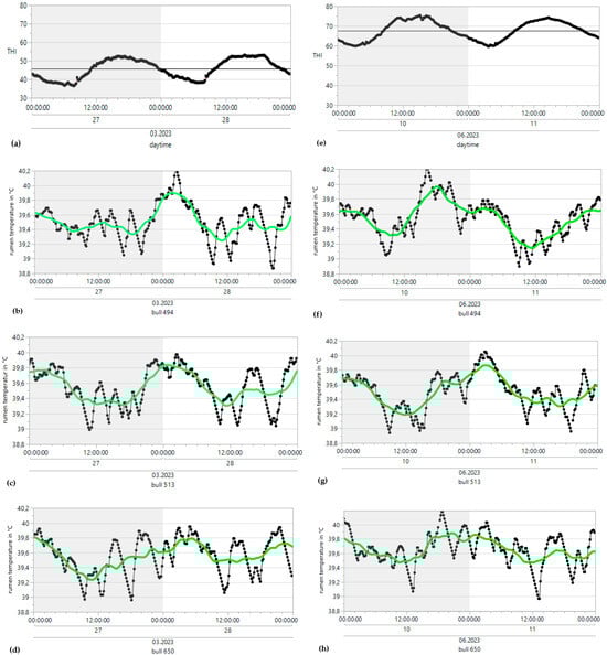 Conclusively, our study could not show that heat load has visible short-term effects on ReT or rumen pH, but rumination is reduced, and motion activity peaks are narrowed on days with high ambient temperatures. Apparently, ReT and pH are rather dependent on diurnal rhythms and, very likely, on feeding cycles. Our goal of using ReT as an early indicator to predict heat load could not be confirmed. Nevertheless, the results revealed a notable decrease in rumen pH and rumination with increasing high THI exposure over a longer period of time. Therefore, considering rumen sensor bolus data to investigate HL in retrospect represents a valid tool for farmers and researchers assessing animal welfare status.