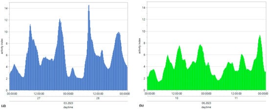 The minimum winter motion activity index was 0.01, the maximum winter amplitude was 52.57, the minimum summer motion activity index was 0.01, and the maximum summer motion activity index was 27.78 (Figure 4d,h). For collective mean motion activity during winter conditions, the result was 5.8, with a SD of 4.6. For summer conditions, the collective mean motion activity was 4.3, with a SD of 3.5. The mean motion activity index was higher during the winter days but followed no specific rhythms or patterns. Table 3 and Table 4 depict the possible correlation between activity index range and daily THImax values from individual bulls, differentiated according to summer and winter conditions, as determined by Pearson’s and Spearman’s correlations. The monthly mean values of our parameters were steady at 5.15 throughout the winter and summer and showed no significant differences or trends (Figure 6). Pearson’s correlations between the THI and activity index from all bulls throughout the entire experiment are described in Table 6.