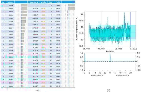 Correlogram (a) and Seasonal ARIMA (3, 0, 0)(11, 0, 0)2 forecast model (b) for bull reticulorumen temperature.