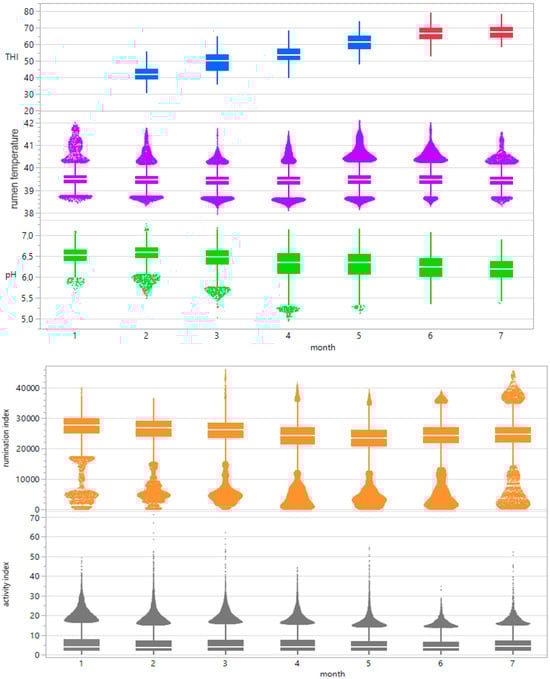 Boxplot progressions of the THI (temperature-humidity index), rumen temperature, rumen pH, rumination index and activity index across 7 months.