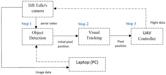 The vision-based target tracking system utilizes a DJI Tello drone as the UAV platform, which communicates with a laptop via a Wi-Fi network connection. An overview of the system is shown in Figure 1.