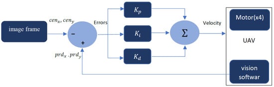 The developed vision-based control system has been designed for a quadrotor UAV equipped with a 640 × 480 pixel onboard camera, facilitating accurate real-time tracking of a moving airborne object. Maintaining the target at the center of the image plane, a PID controller is employed to regulate the UAV’s velocities and yaw angle [39]. The inputs to the PID-based controllers are the image errors at time t, defined as