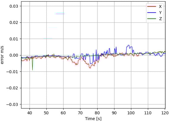 The estimated velocity error of the aerial target is shown in Figure 6. Between 40 and 60 s, the target remains stationary, resulting in minimal velocity error. At , the target begins to move at a constant speed of , causing a slight increase in the error. Despite this increase, the velocity error never exceeds , demonstrating that the proposed state estimation algorithm remains accurate and reliable.