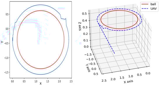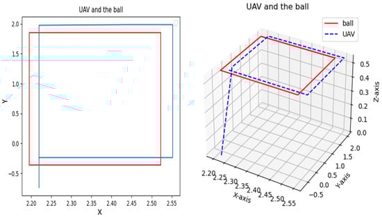 Figure 7 and Figure 8 present the 3D trajectories of both the moving object and the quadrotor, demonstrating the UAV’s ability to successfully navigate and accurately track the target. Within a simulation environment developed using Gazebo and ROS, a ball follows two distinct trajectories a square path (Figure 7) and a circular loop (Figure 8)—while the drone autonomously tracks its motion. Leveraging advanced onboard perception algorithms, the UAV accurately detects the ball’s position and dynamically adjusts its flight path to maintain precise tracking. During the square trajectory (Figure 7), the UAV continuously updates its state estimation to ensure seamless and accurate tracking throughout the entire path. As the ball transitions to the circular trajectory (Figure 8), the drone further refines its control commands to minimize tracking errors. This simulation effectively demonstrates the UAV’s adaptability to different movement patterns and highlights the robustness of integrating vision-based algorithms within the Gazebo–ROS framework for real-time object tracking.