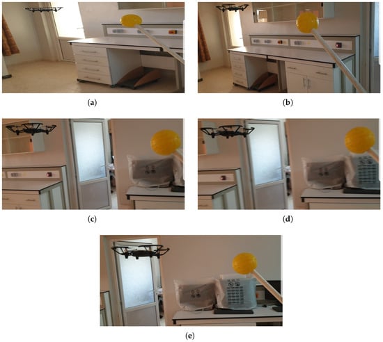 UAV tracking a moving target along a straight-line trajectory. (a) The UAV takes off from the ground, (b) approaches the ball, and (c) follows the ball’s motion; (d) continuous tracking as the ball moves; (e) completes the mission with successful and stable tracking of the ball.