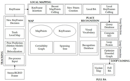 The overall operational workflow can be divided into four main parts: “TRACKING,” “LOCAL MAPPING,” “LOOP CLOSING,” and “FULL BA (Bundle Adjustment).” The “FULL BA” is executed only after the confirmation of the “LOOP CLOSING” phase completion. The operational workflow of ORB-SLAM2 is shown in Figure 1 [15].