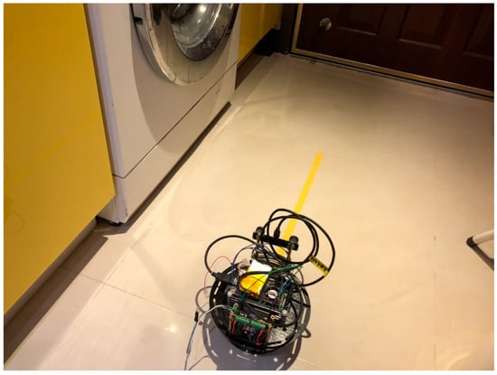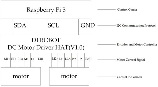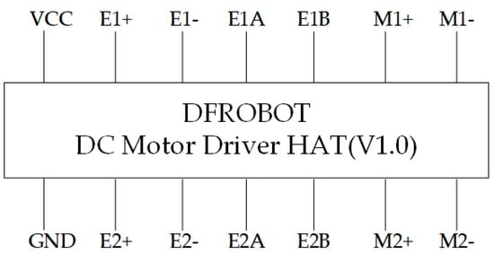 The Raspberry Pi 3 expansion board DFR0592 was employed to ensure smooth operation of the entire system, as depicted in Figure 5 [38]. This is a Raspberry Pi DC motor driver board with an on-board encoder interface, which can drive a 2-way DC motor and a DC motor with encoder [38]. By utilizing the I2C interface, the expansion board enables the vehicle to move at a slow speed of 5–10 rpm.