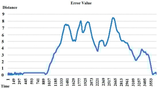 Due to the behavior of the dataset, which involves circling the experimental room from an origin point and returning to the same point. From Figure 13, with time on the horizontal axis and error values on the vertical axis, it is observed that as the distance from the origin point increases, the accumulated error values also increase.