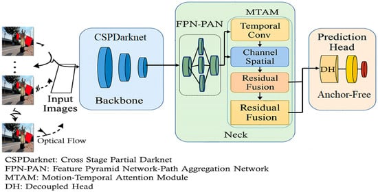 An improved YOLOv8s-based detection architecture, shown in Figure 1, is tailored for real-time and robust performance in highway and autonomous driving scenarios. The design preserves the core CSPDarknet backbone of YOLOv8s while introducing key enhancements in the Neck and Prediction Head to improve temporal consistency and detection accuracy under high-speed conditions. The backbone employs CSPDarknet, composed of convolutional and CSP layers, to extract low- and mid-level features with efficient gradient flow and reduced computational cost. These features are then passed to the Neck, where a combined FPN-PAN structure integrates multi-resolution representations. A central innovation here is the Motion-Temporal Attention Module (MTAM), which captures temporal cues across short frame sequences to improve detection of blurred or fast-moving objects [22,23].