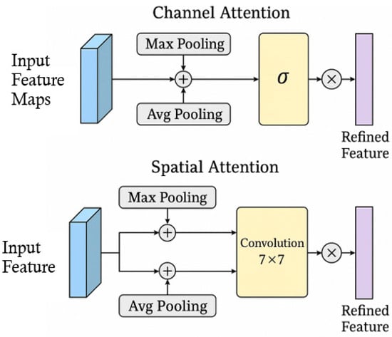 The algorithm steps for the MTAM are designed to enhance object detection in high-speed driving environments by capturing temporal and motion cues from sequential frames. First, a sequence of consecutive input images is passed through the YOLOv8 backbone to extract deep feature maps for each frame. These feature maps are then stacked along the temporal dimension and processed using a temporal convolution layer, which captures motion patterns and dynamic changes across frames. Optionally, optical flow information can be incorporated to guide motion-aware feature alignment. Next, a combined channel and spatial attention mechanism—inspired by convolutional block attention module (CBAM) as shown in Figure 2—is applied to emphasize important features and suppress noise. Channel attention is computed by aggregating global information across spatial dimensions, while spatial attention focuses on the spatial regions that are most relevant for detection. The attention-weighted features are then fused with the original Neck outputs through residual connections, enabling the model to retain both motion-aware and spatially rich features. Moreover, residual fusion is implemented as a two-stage structure to progressively enhance feature integration. The first residual fusion combines dynamic features extracted from temporal convolution with static spatial features derived from the channel–spatial attention mechanism, ensuring effective collaboration of multi-source information. Subsequently, the second residual fusion further refines and strengthens the fused representation, preserving original feature information while mitigating gradient vanishing issues, thereby improving network stability. This final motion-temporal enhanced representation is forwarded to the anchor-free prediction head, enabling more robust detection of fast-moving or blurred objects such as construction vehicles and signs, flag bearers or roadside warning signs, which are common in real-world highway conditions.