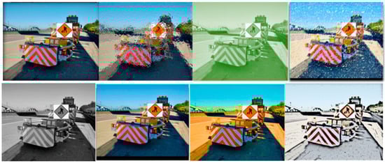 To enhance dataset diversity and prevent overfitting, comprehensive image augmentation was applied. The augmentation pipeline includes transformations such as contrast adjustment, hue and brightness variation, Gaussian blur, saturation shifts, affine distortion, image mixing, and grayscale conversion. Each original image underwent 1 to 3 types of augmentation, depending on content and class distribution. These augmentations were implemented using the Albumentations library in Python, with detailed parameter ranges and probabilities for various image augmentation types, including contrast, mixing, brightness, grayscale, saturation, blur, hue, and noise, listed in Table 3. All augmentations were applied stochastically and validated to avoid data leakage. As a result of the augmentation process, the dataset expanded from 2140 to a total of 34,240 images, significantly enriching training diversity while preserving semantic integrity. Representative examples of these augmentation effects are shown in Figure 3.