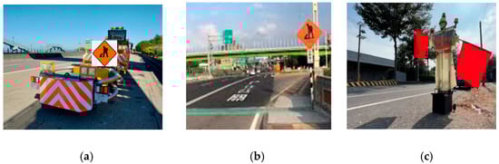 Traffic sign dataset labeling interface: (a) Construction vehicle and sign; (b) Road warning Sign; (c) Electric flag bearer.