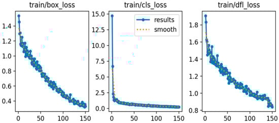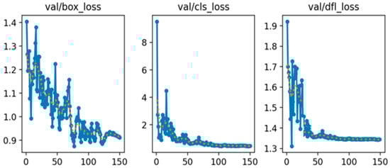 A training/validation/test split was performed on the original images prior to enhancement. The dataset is divided with a split ratio of 8:1:1, corresponding to 80% for the training set, 10% for the test set, and 10% for the validation set. The input image size is fixed at 640 × 640 pixels with a batch size of 24. Training is conducted for 150 epochs using the SGD optimizer with a learning rate of 0.01 and a cosine schedule. The parameters are set as follows: confidence threshold = 0.25, NMS = 0.45, and seed = 42. Loss coefficients remain at their default values, with the complete intersection over union (CIoU) loss function applied. The training and validation loss curves are presented in Figure 6 and Figure 7, respectively, illustrating the bounding box loss (box_loss), classification loss (cls_loss), and distribution focal loss (dfl_loss). As shown in Figure 6, all training loss components consistently decrease and gradually stabilize as the number of epochs increases, reflecting effective convergence of the model. In contrast, the validation loss curves in Figure 7 also exhibit an overall downward trend, although the val/box_loss displays moderate fluctuations throughout training. This behavior suggests that the model maintains strong generalization capability while continuously refining its localization and classification performance on unseen data. The progressive reduction in both training and validation losses confirms the robustness of the optimization strategy and indicates that the proposed framework achieves reliable performance across different evaluation metrics.