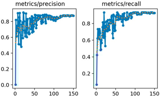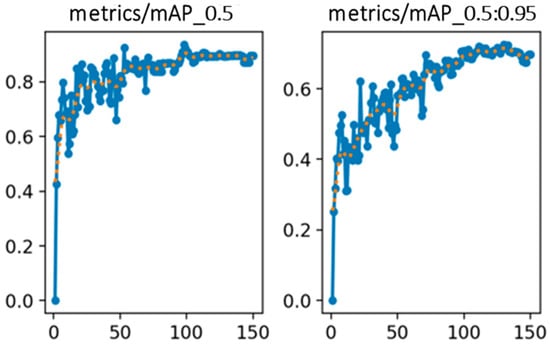 Figure 8 illustrates the variation in the precision and recall rates throughout the training process, while Figure 9 shows the changes in the mAP at two different IoU[0.5] and IoU[0.5:0.95]. These curves reflect the model’s improving detection capability over time. For performance evaluation, the mAP index is adopted as a key accuracy metric. To assess the statistical robustness of model performance across different object classes, we apply k-fold cross-validation and compute evaluation metrics such as precision, recall, and mAP across all k folds [29,30]. For each class and metric, we first calculate the mean (μ) and standard deviation (σ) across k folds. The average is given by: