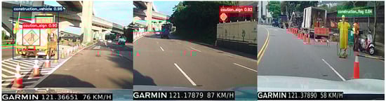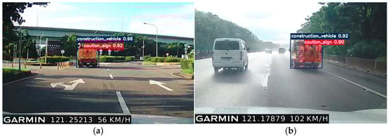 As illustrated in Figure 11, the proposed detection system demonstrates consistent recognition performance under different driving conditions, including variations in speed, distance, and weather. In Figure 11a, the construction vehicle and sign are moving at approximately 56 km/h on an expressway interchange. At this speed and an estimated detection distance of around 40 m, the system accurately identifies the construction vehicle and warning sign with confidence levels of 96% and 92%, respectively. In contrast, Figure 11b presents a scenario where the host vehicle is traveling at 102 km/h on the expressway during rainy weather, with the distance to the construction vehicle ahead increasing to about 50 m. Even under these more challenging conditions, the detection system achieves confidence levels of 92% for the construction vehicle and 90% for the caution sign, confirming its robustness in high-speed and low-visibility environments.