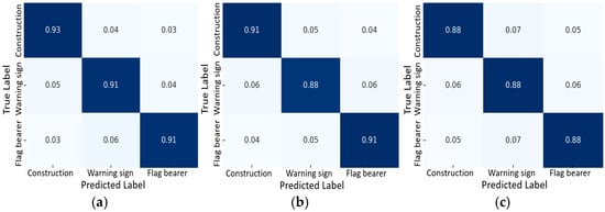 Confusion matrices illustrating classification accuracy for (a) construction vehicles and signs, (b) roadside warning signs, and (c) electronic flag bearers.
