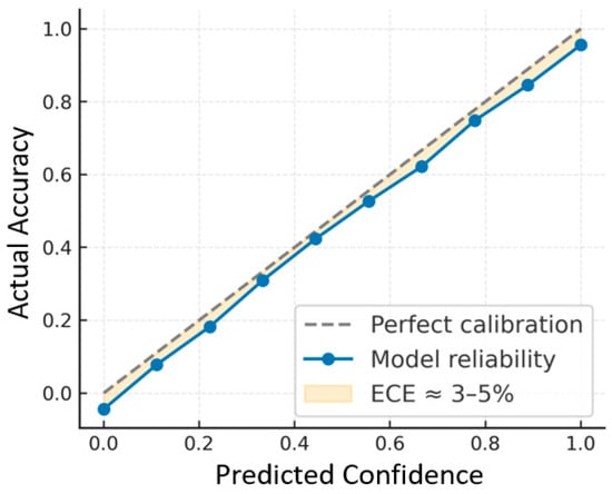 Model-confidence calibration was analyzed using the expected calibration error (ECE), shown in Figure 13. The reliability diagram compares predicted confidence with observed accuracy across probability bins. The small deviation between the ideal and empirical curves indicates strong calibration, with ECE between 3% and 5%. These results confirm that the YOLOv8s-MTAM provides not only high detection accuracy but also well-calibrated confidence estimates, a key requirement for reliable, real-time decision-making in intelligent-transportation and autonomous-driving systems.