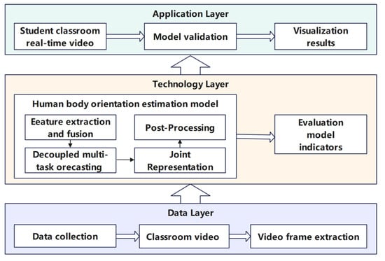 We propose a three-layer architecture for an intelligent student engagement analysis in authentic classroom settings, including data, technology, and application layers, as shown in Figure 1. First, the data layer collects learning state data with two cameras installed on the front and rear walls of the classroom. These continuous video streams are further converted into discrete frames with a sample rate of 3 s as the input for the following engagement analysis. Second, the technology layer integrates the proposed multi-person body orientation estimation method to identify all the students’ locations and body orientation angles in real time. Third, the application layer offers a real-time visual display, where bounding boxes and orientation narrows are represented for students and their orientation directions, respectively. To the end, the proposed architecture is successfully applied to analyze student engagement levels in authentic teaching with various layouts, including regular configuration, small-group discussions, and circular seminar configurations. Students’ engagement is intricately linked to their attention directions, which can be inferred from their body orientation. The frequency of their orientation changes and whether these changes are teacher-directed both indicate students’ engagement levels. The experimental section provides a detailed analysis of both patterns.