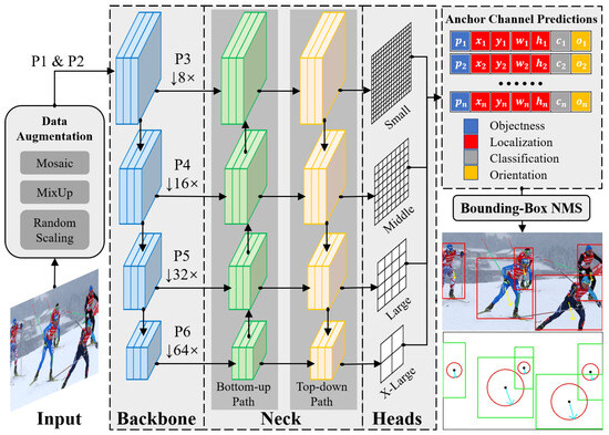 Our architecture builds upon YOLOv11 [37]. The input image is initially processed via the CSPDarknet53 [29] backbone to extract feature maps at four different scales P3, P4, P5, and P6. These multi-scale features are then fused using PANet [38] at the neck. The fused features are passed to detection heads, where each anchor channel produces a unified output that includes both bounding box and orientation predictions. The square frame represents the human body position, and the circular frame indicates the 360-degree orientation information of the human body on the 2D plane.